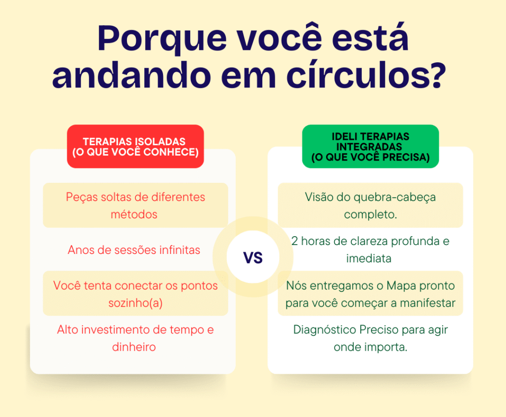 Não. O Diagnóstico e a Bússola 4π é o passo inicial e fundamental para a clareza, pois te entrega o Mapa de Raiz do seu Propósito Bloqueado. A cura e o desenvolvimento completo do seu Legado podem ser feitos na nossa Rota IDELI de desenvolvimento contínuo ou como você preferir, caso queira fazer com outros terapeutas você tem total liberdade.